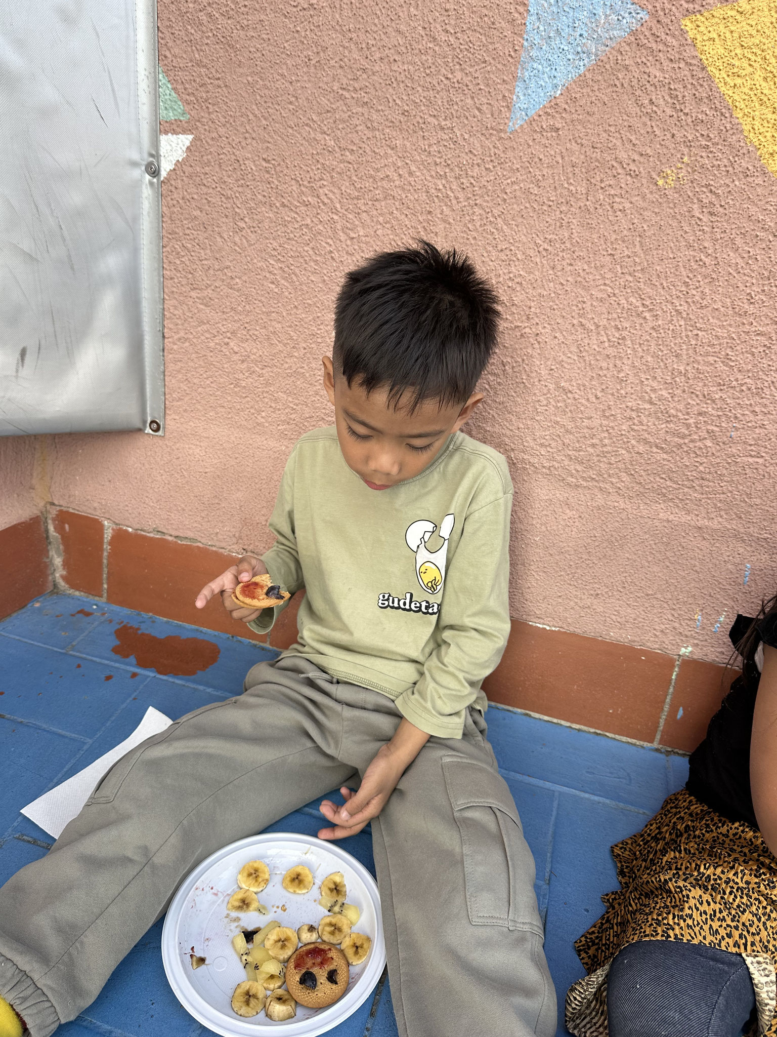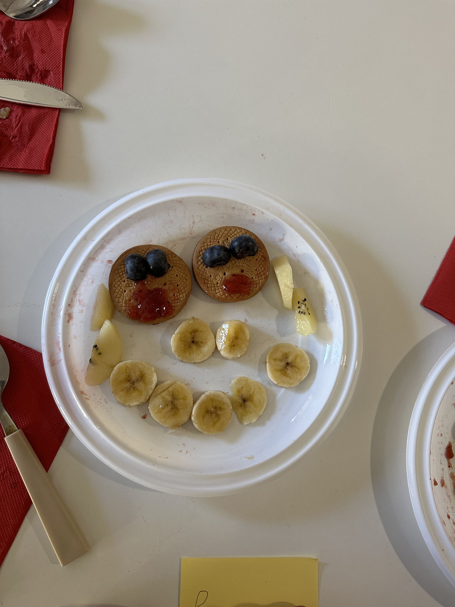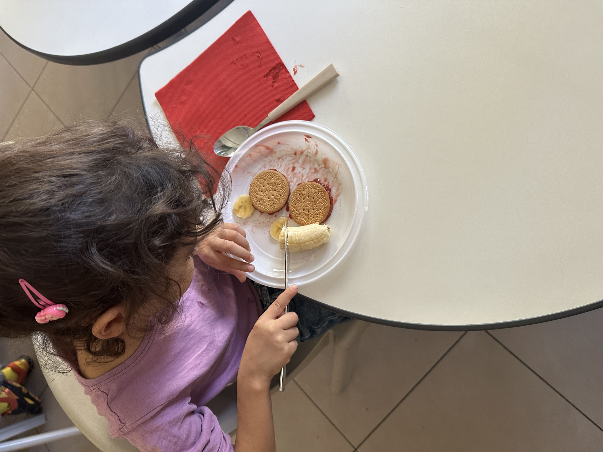 La classe de 1r ha fet un berenar amb melmelada de maduixa. Hem utilitzat quatre galetes, melmelada de maduixa, plàtan, kiwi i nabius.
