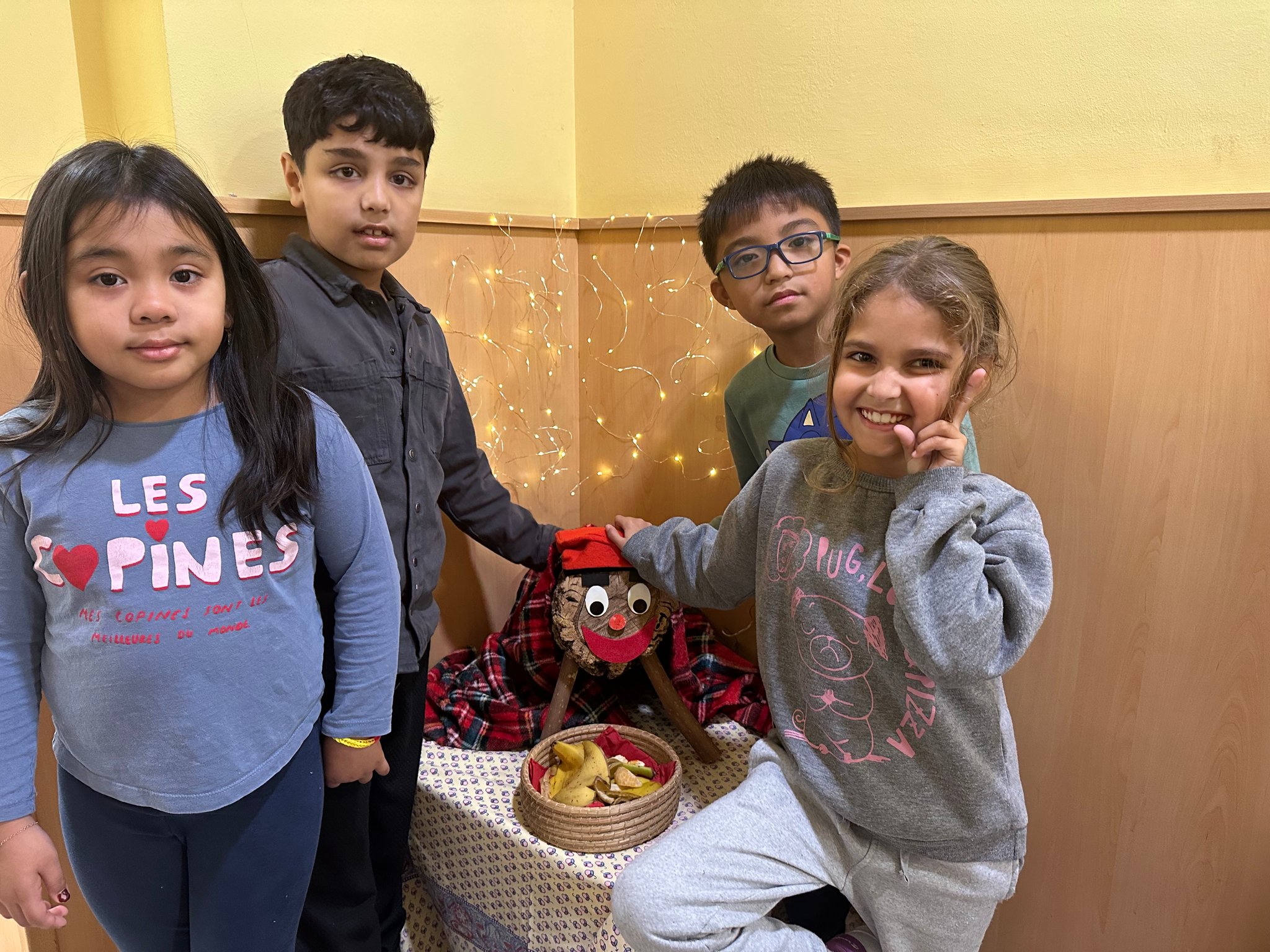 La classe de les maduixes i la classe dels petards han trobat el tió al pati de l'escola. Quina il·lusió! Tenim moltes ganes de cuidar-lo i donar-li molt de menjar perquè ens pugui cagar molts regals.